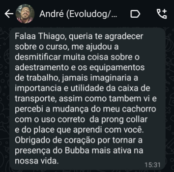 Grupo exclusivo de WhatsApp para tirar dúvidas sobre o conteúdo do curso diretamente com o Thiago Evoludog.